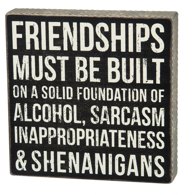 A classic black and white wooden box sign featuring a distressed “Friendships Must Be Built On A Solid Foundation Of Alcohol, Sarcasm, Inappropriateness & Shenanigans” sentiment with zigzag trim designs. Easy to hang or can free-stand alone.